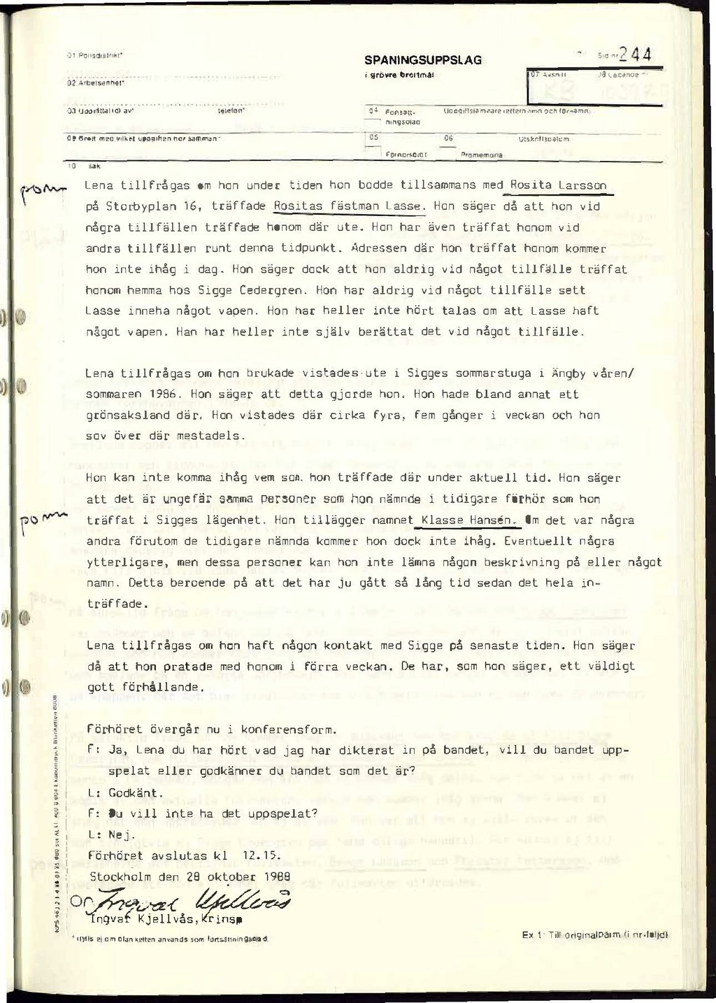 Lena tillfrågas om hon under tiden hon bodde tillsammans med Rosita Larsson på Storbyplan 16, träffade Rositas fästman Lasse. Hon säger då att hon vid några tillfällen träffade honom där ute. Hon har även träffat honom vid andra tillfällen runt denna tidpunkt. Adressen där hon träffat honom kommer hon inte ihåg i dag. Hon säger dock att hon aldrig vid något tillfälle träffat honom hemma hos Sigge Cedergren. Hon har aldrig vid något tillfälle sett Lasse inneha något vapen. Hon har heller inte hört talas om att Lasse haft något vapen. Han har heller inte själv berättat det vid något tillfälle.