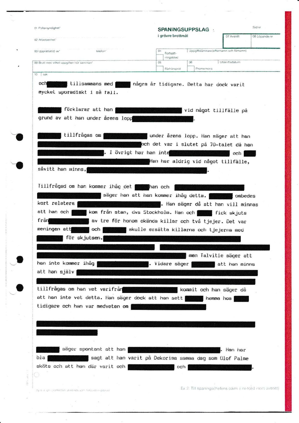 ochtillsammans mednågra år tidigare. Detta har dock varit myckel sporadiskt i så fall.förklarar att hanvid något tillfälle på grund av att han under årens lopp.tillfrågas omunder årens lopp. Han säger att hanoch det var i slutet på 70-talet då han. I övrigt har han inteochHan har aldrig vid något tillfälle, săvitt han minns,Tillfrågad om han kommer ihåg dethan och(säger han att han kommer ihåg detta. Iombedes kort relatera. Han säger då att han vill minnas att han ochkom från stan, dvs Stockholm. Han ochfick skjuts frånav tre för honom okända killar och två tjejer. Det var meningen att|ochskulle ersätta killarna och tjejerna medför skjutsen.men Talvitie säger att han inte kommer ihåg. Vidare sägeratt han minns att han självtillfrågas om han vet varifrånkommit och han säger då att han inte vet detta. Han säger dock att han setthemma hos (tidigare och han var medveten omsäger spontant att han. Han har bla (sagt att han varit på Dekor ima samma dag som Olof Palme sköts och att han där varit ochoch.
