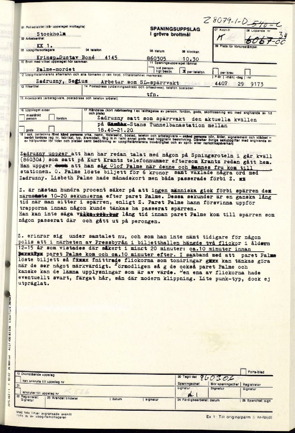 Sergiusz Zadruzny uppger att han har redan talat med någon på Spaningsroteln i går kväll (1986-03-04) som satt på Kurt Krantz telefonnummer eftersom Krantz redan gått hem.