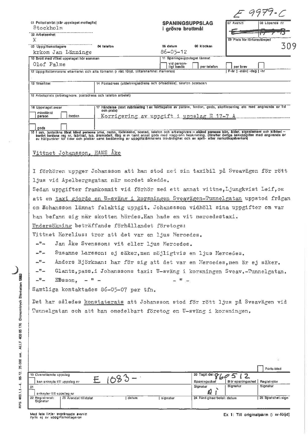 Anders Björkman: har för sig att det var en Mercedes, men är ej säker. Glantz, pass.i Johanssons taxi: U-sväng i korsningen Sveavägen-Tunnelgatan. EDssonSamtliga kontaktades 86-05-07 per tfn.