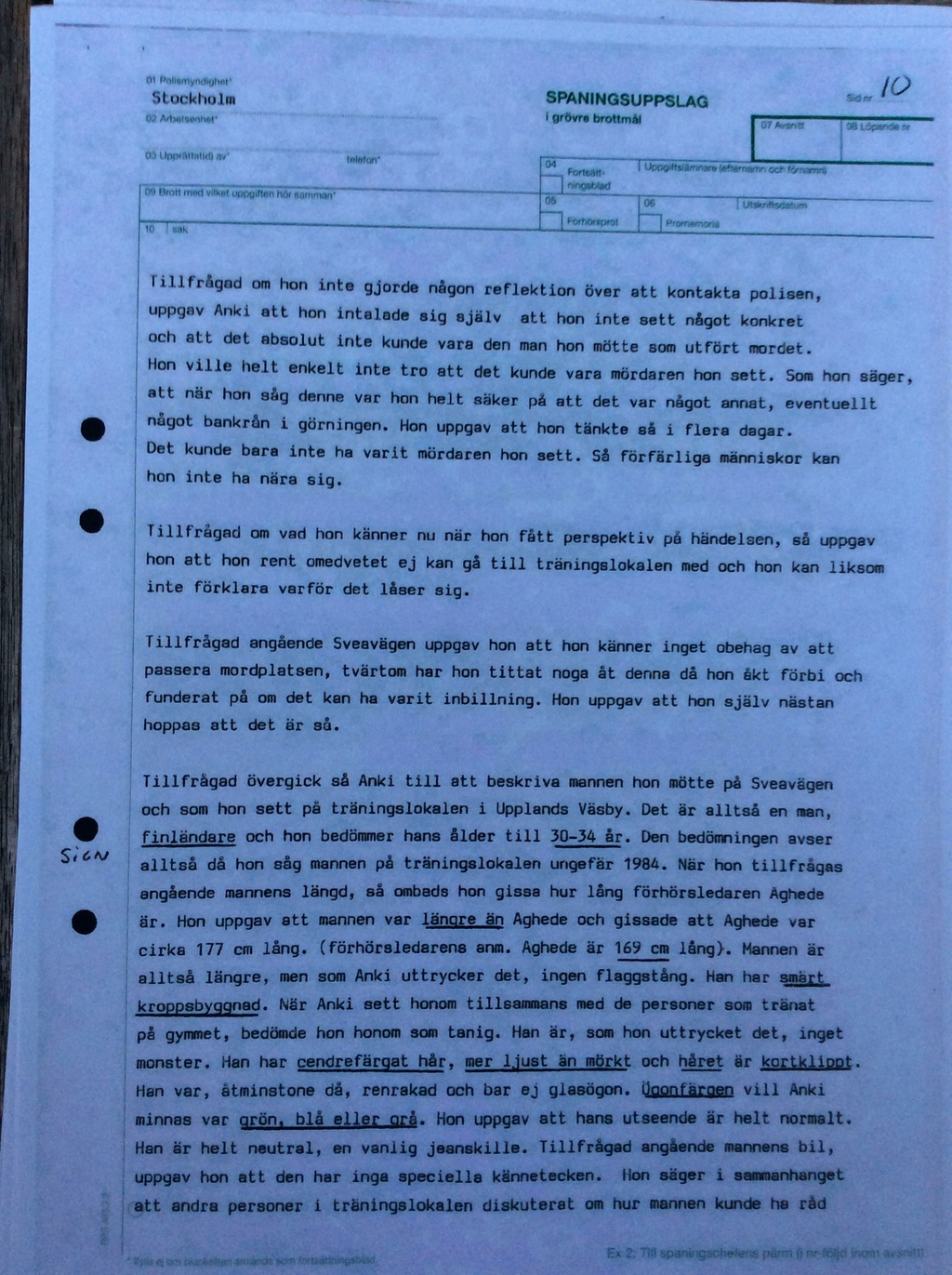 Tillfrågad övergick så Anki till att beskriva mannen hon mötte på Sveavägen och som hon sett på träningslokalen i Upplands Väsby. Det är alltså en man, finländare och hon bedömmer hans ålder till 30-34 år. Den bedömningen avser då hon såg mannen på träningslokalen ungefär 1984. När hon tillfrågas mannens längd, så ombads hon gissa hur lång förhörsledaren Äghede . Hon uppgav att mannen var längre än Aghede och gissade att Aghede var 177 cm lång. (förhörsledarens anm. Aghede är 169 cm lång). Mannen är längre, men som Anki uttrycker det, ingen flaggstång. Han har smärt . När Anki sett honom tillsammans med de personer som tränat gymmet, bedömde hon honom som tanig. Han är, som hon uttrycket det, inget . Han har cendrefärgat hår, mer ljust än mörkt och håret är kortklippt. var, åtminstone då, renrakad och bar ej glasögon. Ögonfärgen vill Anki var grön, blå eller arå. Hon uppgav att hans utseende är helt normalt. är helt neutral, en vanlig jeanskille. Tillfrågad angående mannens bil, hon att den har inga speciella kännetecken. Hon säger i sammanhanget andra personer i träningslokalen diskuterat om hur mannen kunde ha råd
