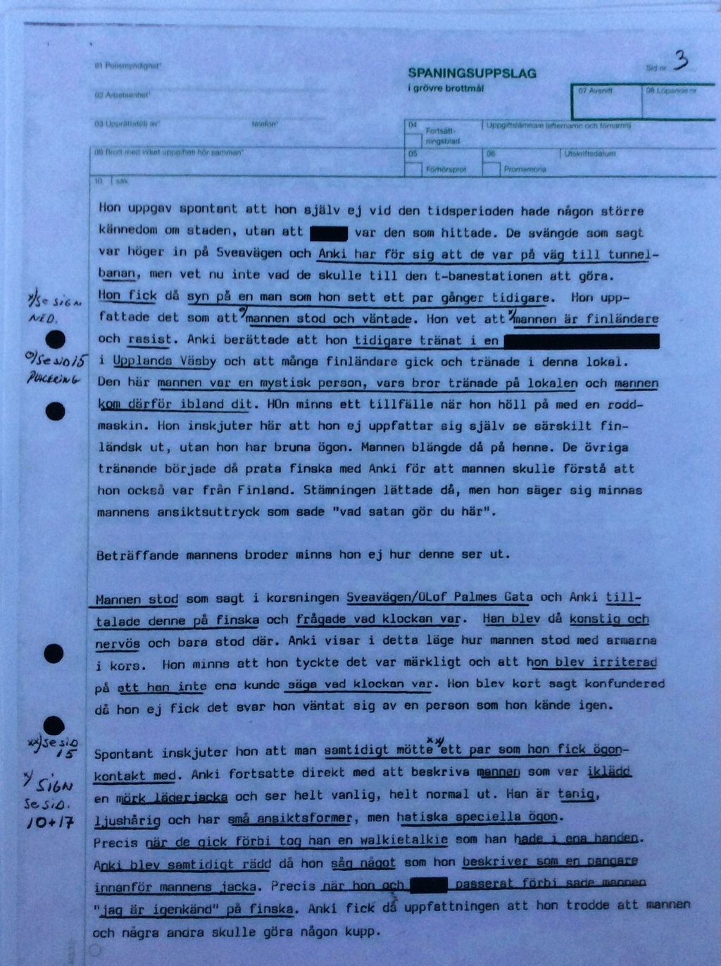 fick då syn på en man som hon sett ett par gånger tidigare. Hon uppdet som att mannen stod och väntade. Hon vet att mannen är finländare rasist. Anki berättade att hon tidigare tränat i en