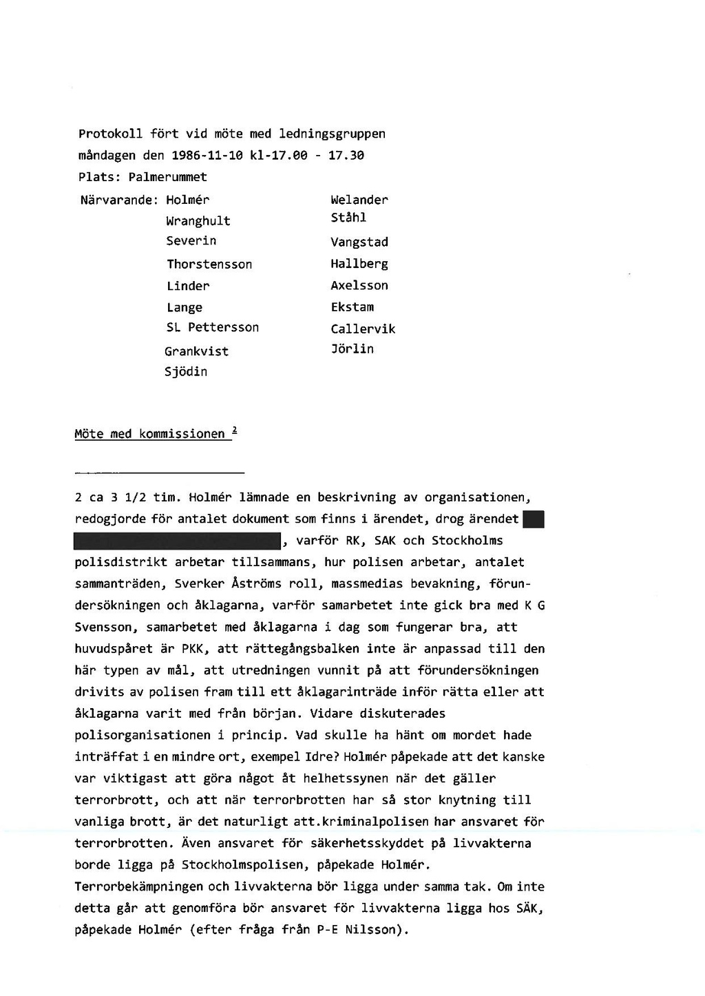 2 ca 3 1/2 tim. Holmér lämnade en beskrivning av organisationen, redogjorde för antalet dokument som finns i ärendet, drog ärendet varför RK, SAK och Stockholms polisdistrikt arbetar tillsammans, hur polisen arbetar, antalet sammanträden, Sverker Åströms roll, massmedias bevakning, förundersökningen och åklagarna, varför samarbetet inte gick bra med K G Svensson, samarbetet med åklagarna i dag som fungerar bra, att huvudspåret är PKK, att rättegångsbalken inte är anpassad till den här typen av mål, att utredningen vunnit på att förundersökningen drivits av polisen fram till ett åklagarinträde inför rätta eller att åklagarna varit med från början. Vidare diskuterades polisorganisationen i princip. Vad skulle ha hänt om mordet hade inträffat i en mindre ort, exempel Idre? Holmér påpekade att det kanske var viktigast att göra något åt helhetssynen när det gäller terrorbrott, och att när terrorbrotten har så stor knytning till vanliga brott, är det naturligt att.kriminalpolisen har ansvaret för terrorbrotten. Även ansvaret för säkerhetsskyddet på livvakterna borde ligga på Stockholmspolisen, påpekade Holmér.