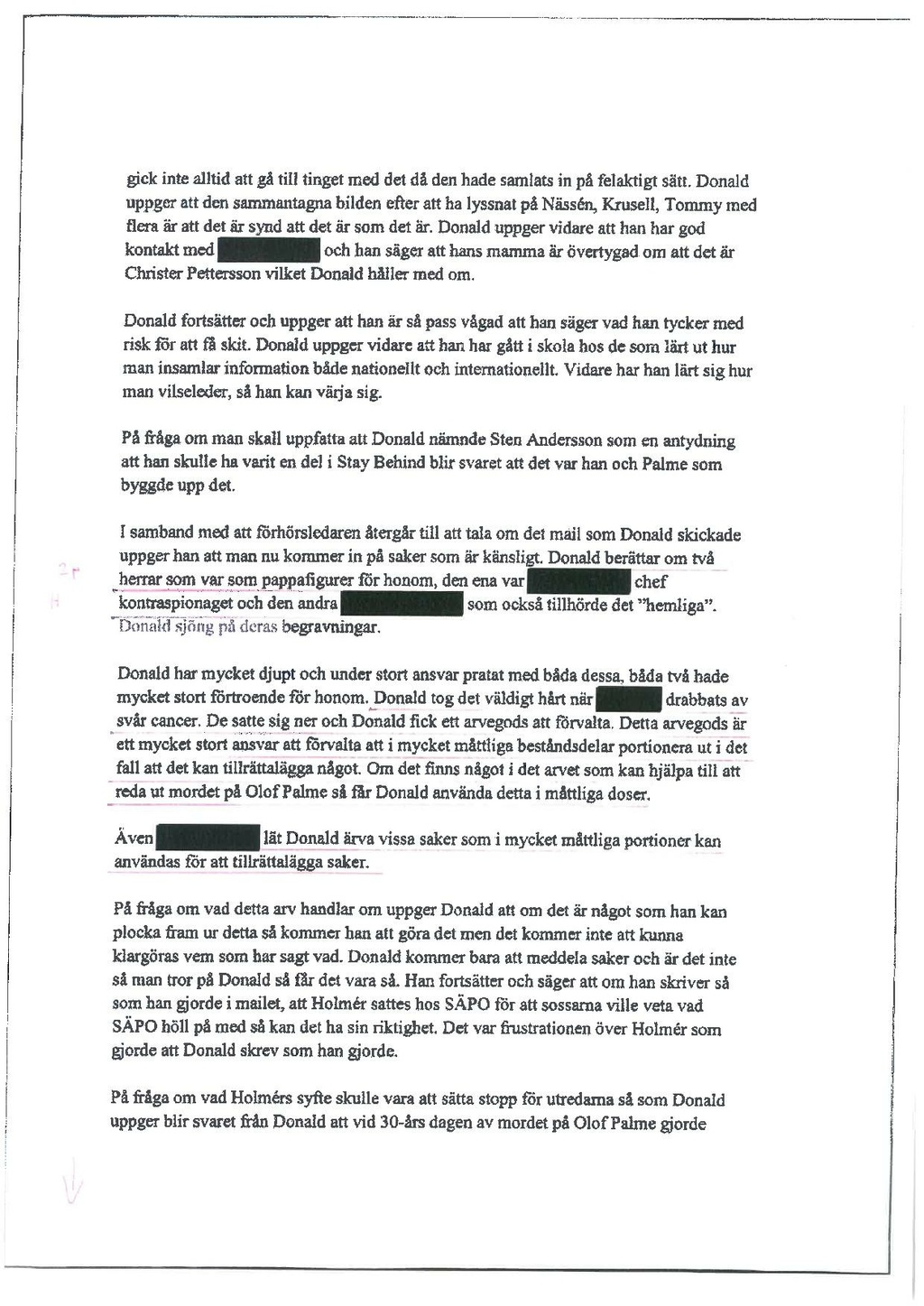 svår cancer. De satte sig ner och Donald fick ett arvegods att förvalta. Detta arvegods är ett mycket stort ansvar att förvalta att i mycket måttliga beståndsdelar portionera ut i det fall att det kan tillrättalägga något. Om det finns något i det arvet som kan hjälpa till att reda ut mordet på Olof Palme så får Donald använda detta i måttliga doser.