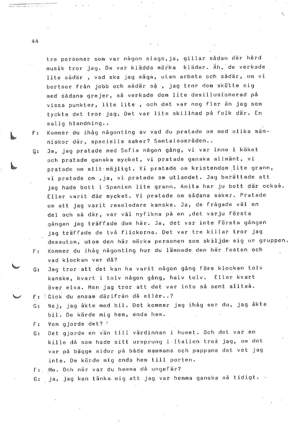 G: De var klädda mörka kläder. Än, de verkade lite sådär vad ska jag säga, utan arbete och sådär, om vi bortser från jobb och sådär så, jag tror dom skötte sig med sådana grejer, så verkade dom lite desillusionerad på vissa punkter, lite lite, och det var nog fler än jag som tyckte det tror jag. Det var lite skillnad på folk där. En salig blandning.. Kommer du ihåg någonting av vad du pratade om med olika människor där, speciella saker? Samtalsområden.. G: Ja, jag pratade med Sofia någon gång, vi var inne i köket och pratade ganska mycket, vi pratade ganska allmänt, vi pratade om allt möjligt. Vi pratade om kristendom lite grann, vi pratade om ja, vi pratade om utlandet. Jag berättade att jag hade bott i Spanien lite grann. Anita har ju bott där också. Eller varit där mycket. Vi pratade om sådana saker. Pratade om att jag varit reseledare kanske. Ja, de frågade väl en del och så där, var väl nyfikna på en , det var ju första gången jag träffade dom här. Ja, det var inte första gången jag träffade de två flickorna. Det var tre killar tror jag dessutom, utom den här mörka personen som skiljde sig, ur gruppen.