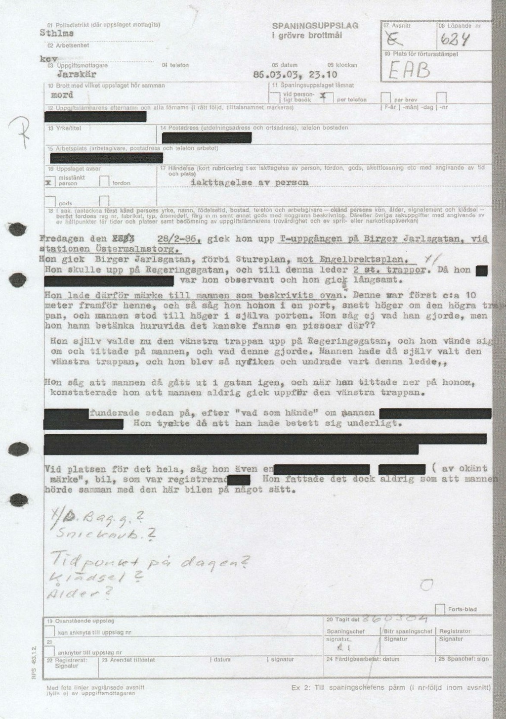 28/2-86, gick hon upp T-uppgången på Birger Jarlsgatan, vid