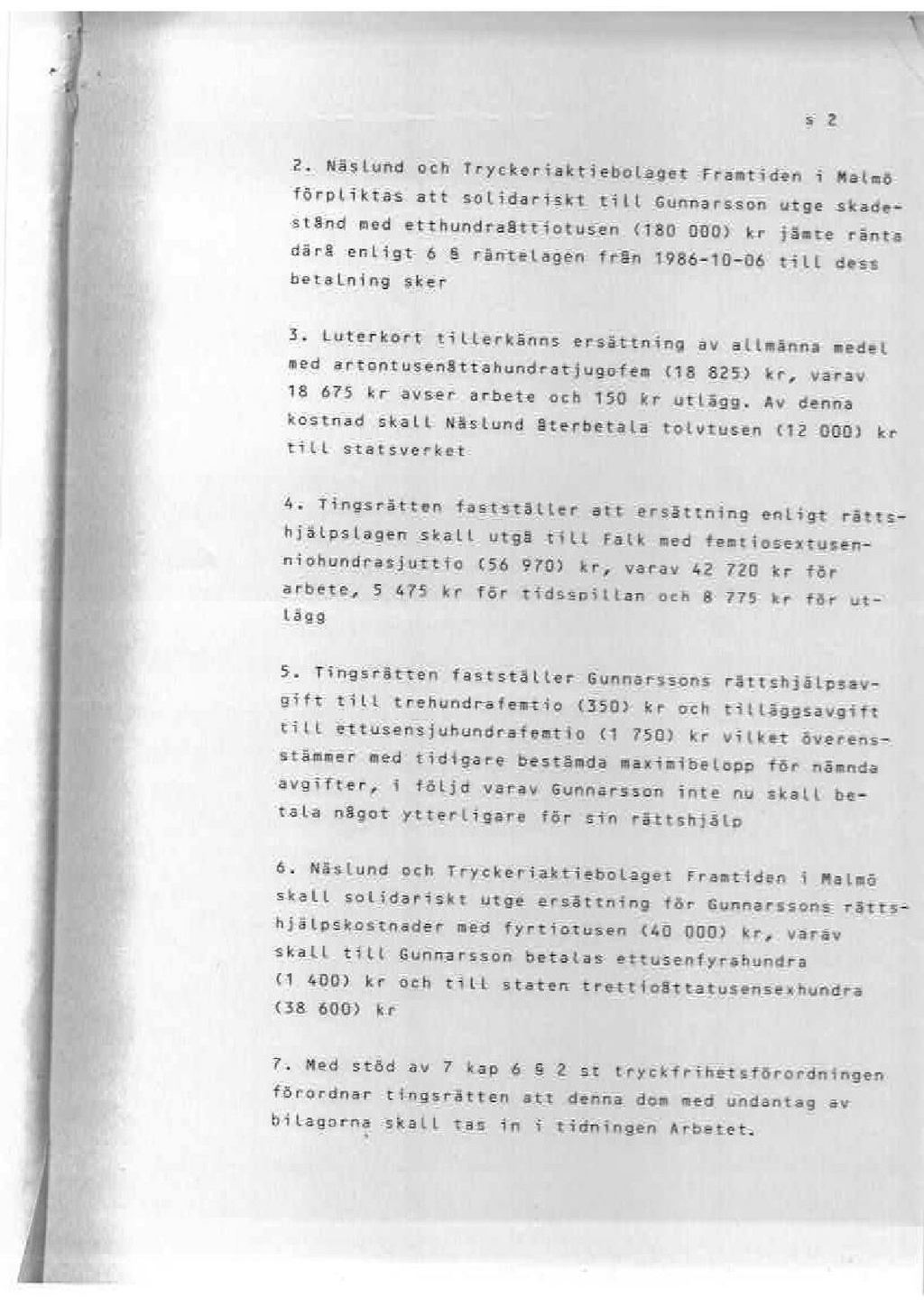 2. Näslund och Tryckeriaktiebolaget Framtiden i Malmö förpliktas att solidariskt till Gunnarsson utge skadestånd med etthundraattiotusen (180 000) kr jämte ränta dārå enligt 6 & räntelagen från 1986-10-06 till dess betalning sker