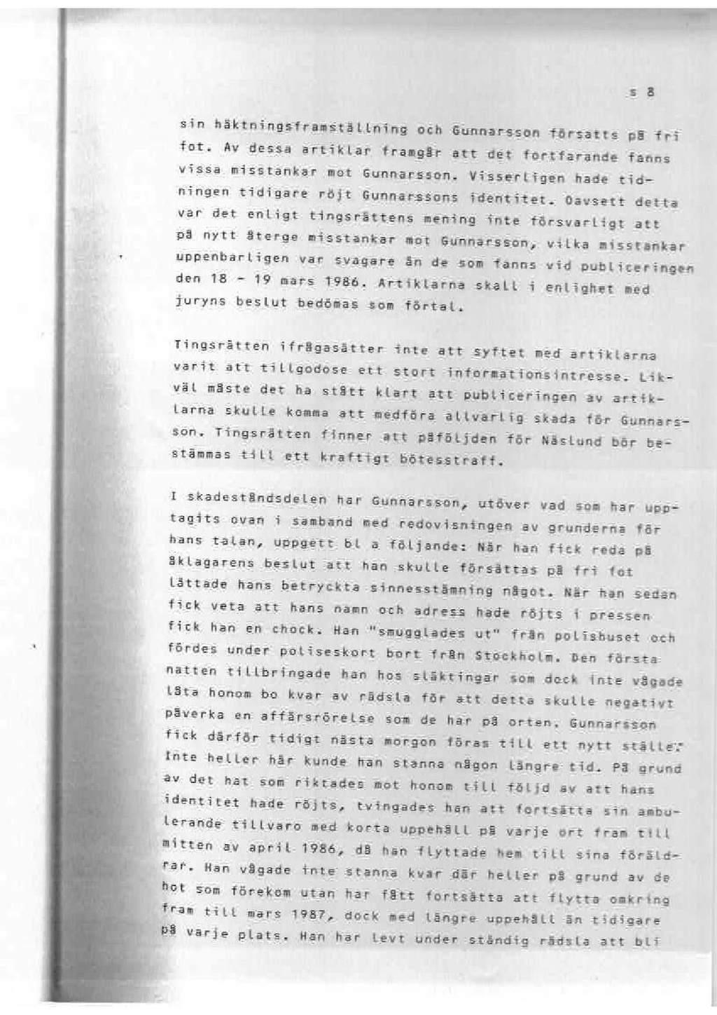sin häktningsframställning och Gunnarsson försatts på fri fot. Av dessa artiklar framgår att det fortfarande fanns vissa misstankar mot Gunnarsson. Visserligen hade tidningen tidigare röjt Gunnarssons identitet. Oavsett detta var det enligt tingsrättens mening inte försvarligt att på nytt återge misstankar mot Gunnarsson, vilka misstankar uppenbarligen var svagare än de som fanns vid publiceringen den 18 - 19 mars 1986. Artiklarna skall i enlighet med juryns beslut bedömas som förtal.