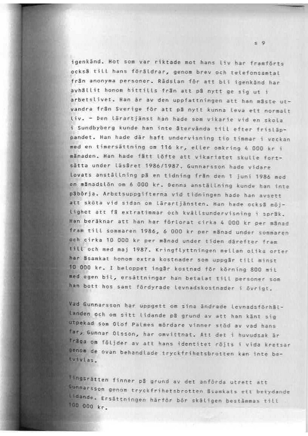 igenkänd. Hot som var riktade mot hans liv har framförts också till hans föräldrar, genom brev och telefonsamtal från anonyma personer. Rädslan för att bli igenkänd har avhållit honom hittills från att på nytt ge sig ut i arbetslivet. Han är av den uppfattningen att han måste utvandra fråm Sverige för att på nytt kunna leva ett normalt Liv. - Den Lärartjänst han hade som vikarie vid en skola i Sundbyberg kunde han inte återvända till efter frisläppandet. Han hade där haft undervisning tio timmar i veckan med en timersättning om 116 kr, eller omkring 4 000 kr i månaden. Han hade fått löfte att vikariatet skulle fortsätta under låsåret 1986/1987. Gunnarsson hade vidare lovats anställning på en tidning från den 1 juni 1986 med en månadslön om 6 000 kr. Denna anställning kunde han inte påbörja. Arbetsuppgifterna vid tidningen hade han avsett att sköta vid sidan om Lärartjänsten. Han hade också möjlighet att få extratimmar och kvällsundervisning i språk. Han beräknar att han har förlorat cirka 4 000 kr per månad fram till sommaren 1986, 6 000 kr per månad under sommaren och cirka 10 000 kr per månad under tiden därefter fram till och med maj 1987. Kringflyttningen mellan olika orter har samkat honom extra kostnader som uppgår till minst 10 000 kr. I beloppet ingår kostnad för körning 800 mil med egen bil, ersättningar han betalat till personer som han bott hos samt fördyrade Levnadskostnader i övrigt.