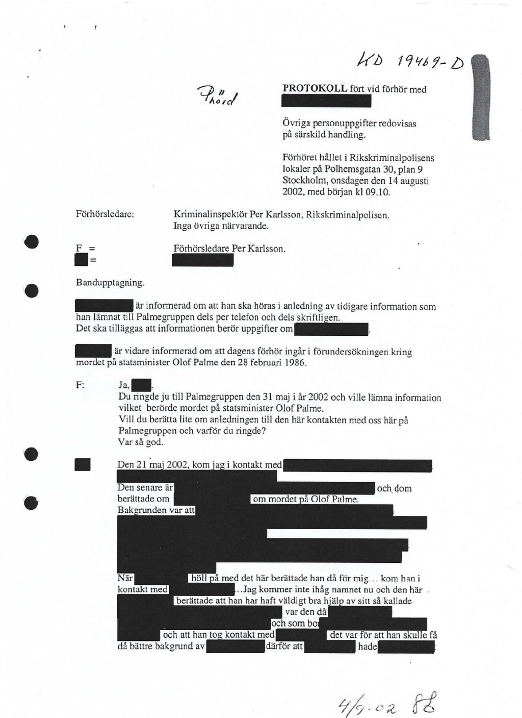 Förhöret hållet i Rikskriminalpolisens lokaler på Polhemsgatan 30, plan 9 Stockholm, onsdagen den 14 augusti 2002, med början kl 09.10.