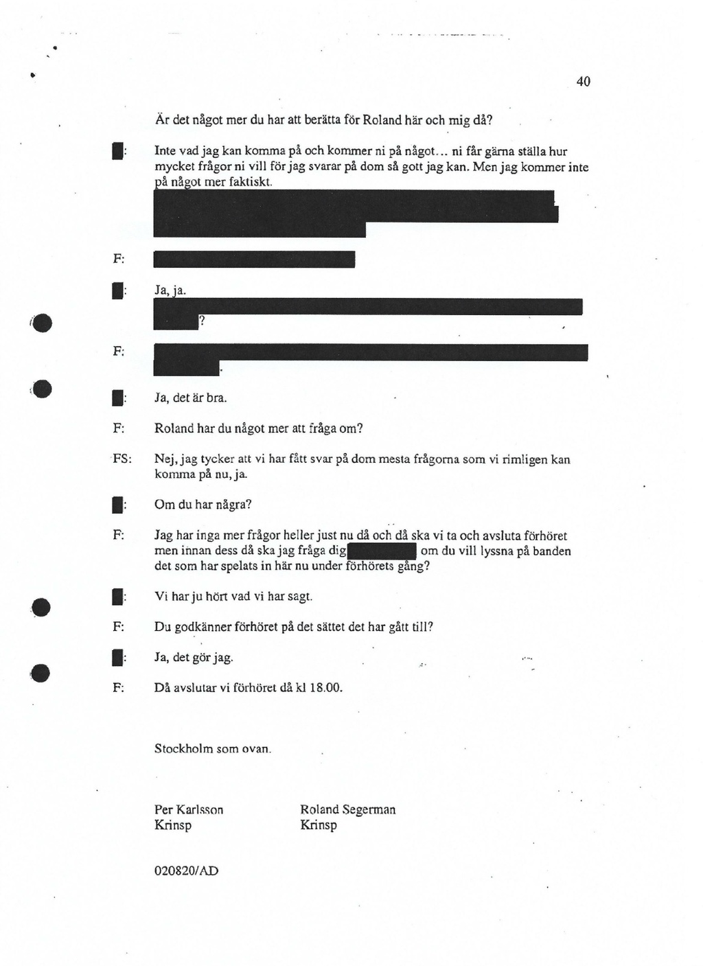 F: Ja, det är bra. Roland har du något mer att fråga om? Nej, jag tycker att vi har fått svar på dom mesta frågorna som vi rimligen kan komma på nu, ja. Om du har några? Jag har inga mer frågor heller just nu då och då ska vi ta och avsluta förhöret men innan dess då ska jag fråga dig om du vill lyssna på banden det som har spelats in här nu under förhörets gång? Vi har ju hört vad vi har sagt. F: Du godkänner förhöret på det sättet det har gått till? F: Ja, det gör jag. Då avslutar vi förhöret då kl 18.00. Stockholm som ovan. Per Karlsson Roland Segerman Krinsp Krinsp 020820/AD
