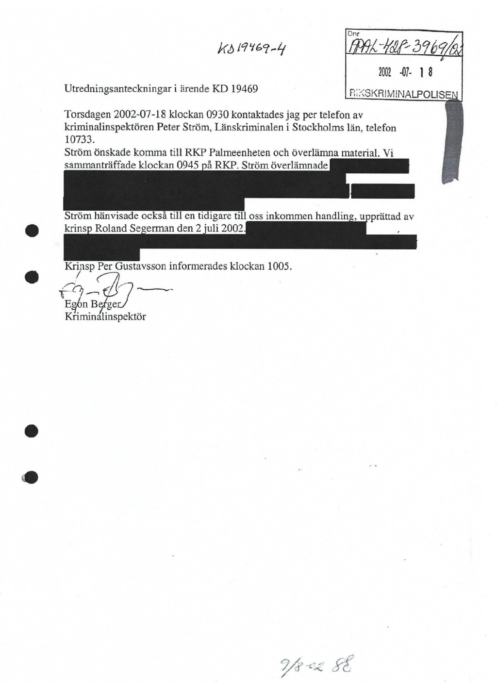 Torsdagen 2002-07-18 klockan 0930 kontaktades jag per telefon av kriminalinspektören Peter Ström, Länskriminalen i Stockholms län, telefon