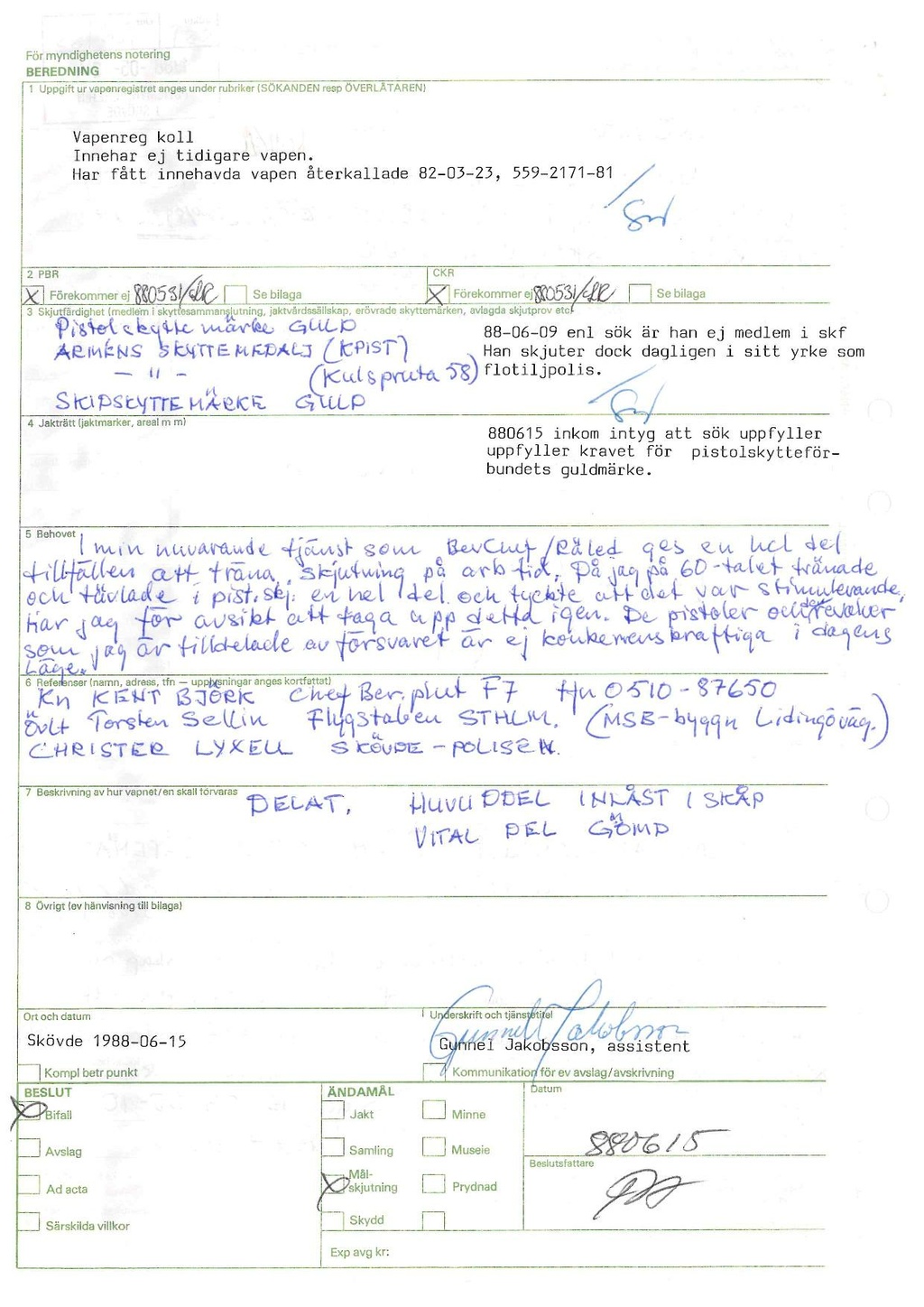 880615 inkom intyg att sök uppfyller uppfyller kravet för pistolskytteför- bundets guldmärke.