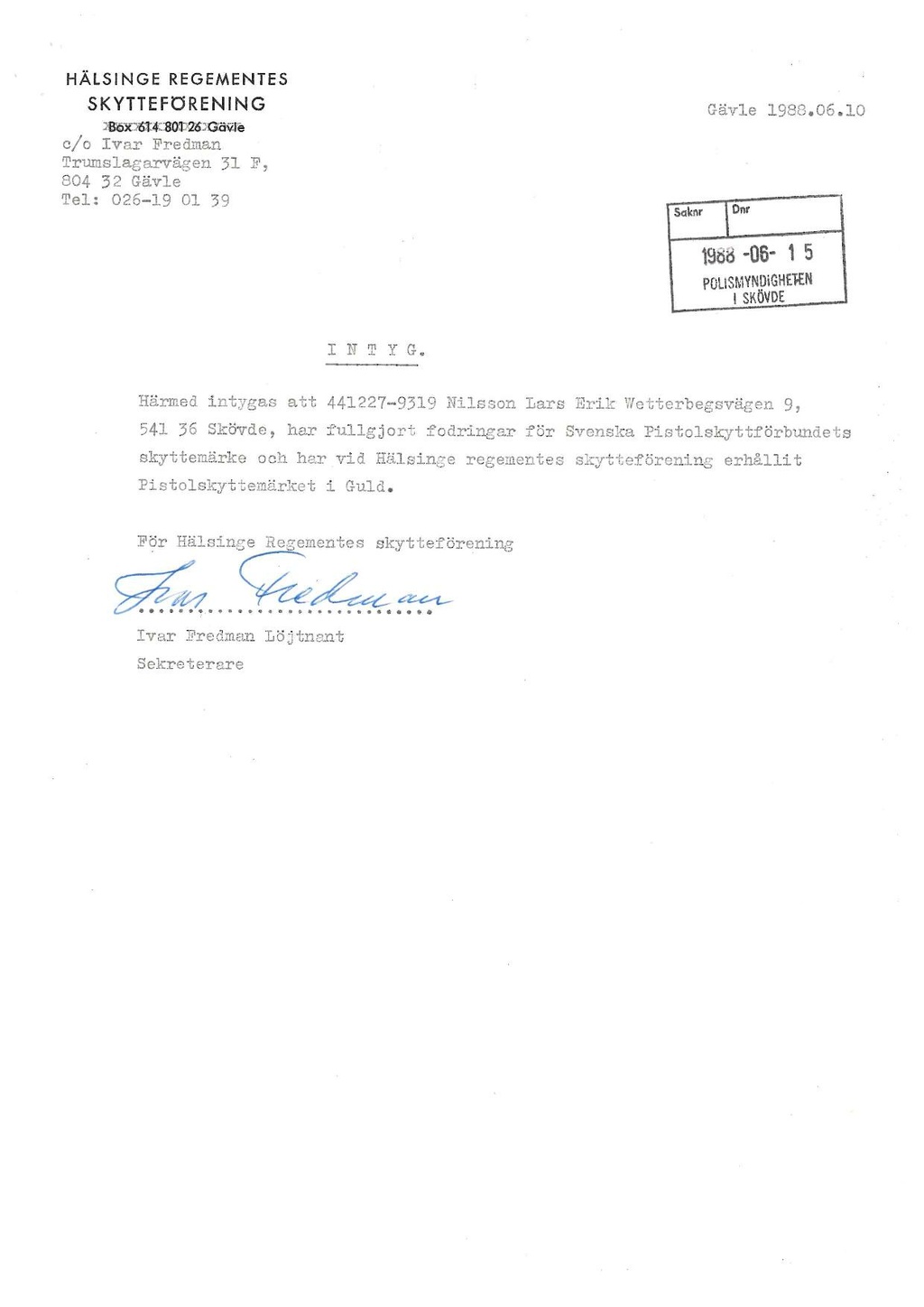 Härmed intygas att 441227-9319 Nilsson Lars Erik Wetterbegsvägen 9, 541 36 Skövde, har fullgjort fodringar för Svenska Pistolskyttförbundets skyttemärke och har vid Hälsinge regementes skytteförening erhållit Pistolskyttemärket i Guld.