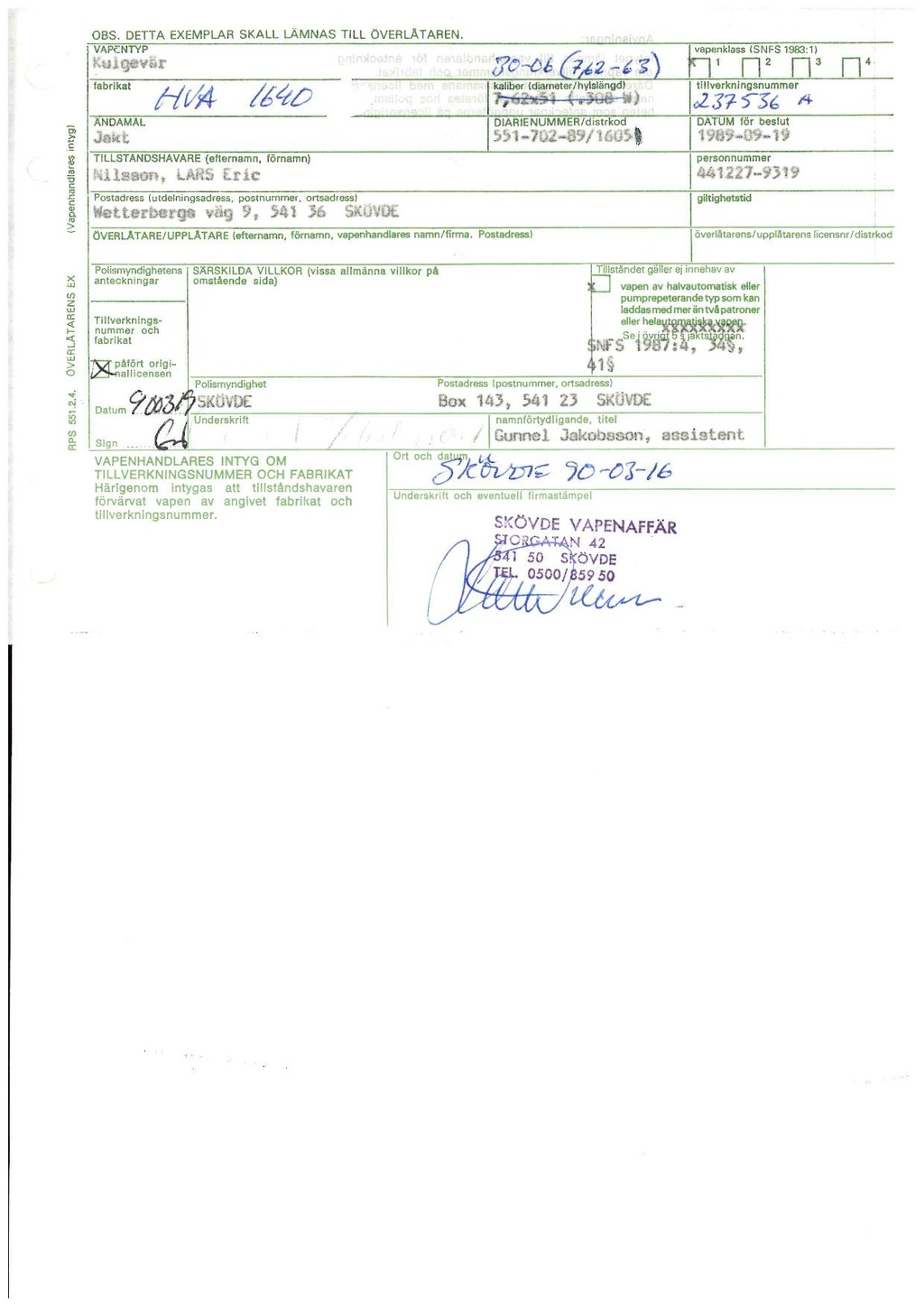 ÖVERLÅTARE/UPPLÅTARE (efternamn, förnamn, vapenhandlares namn/firma. Postadress)