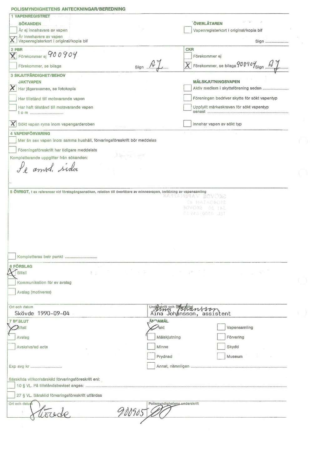 , t ex referenser vid förstagångsansökan, relation till överlåtare av minnesvapen, inriktning av vapensamling