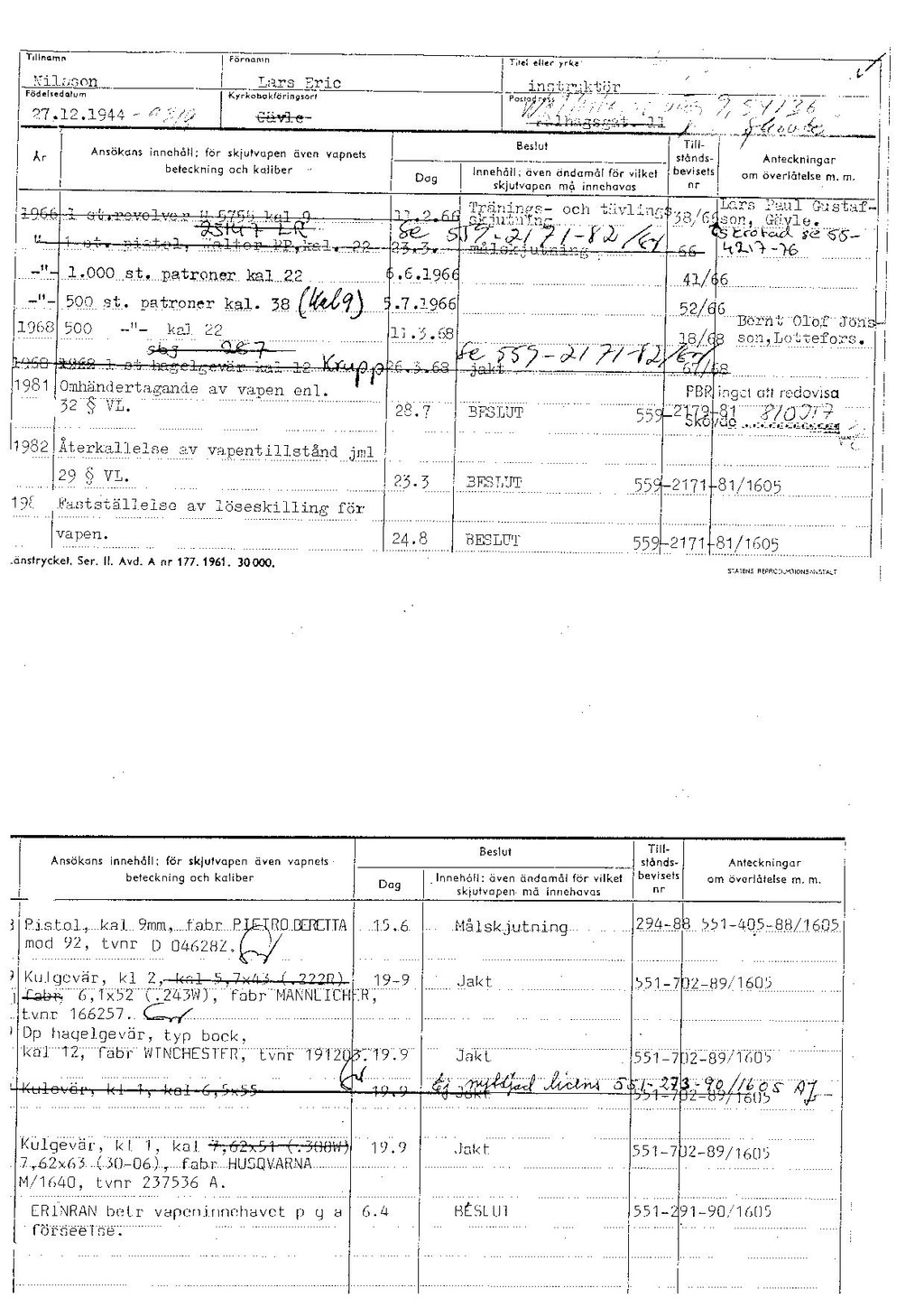 Ansökans innehåll; för skjutvapen även vapnets beteckning och kaliber