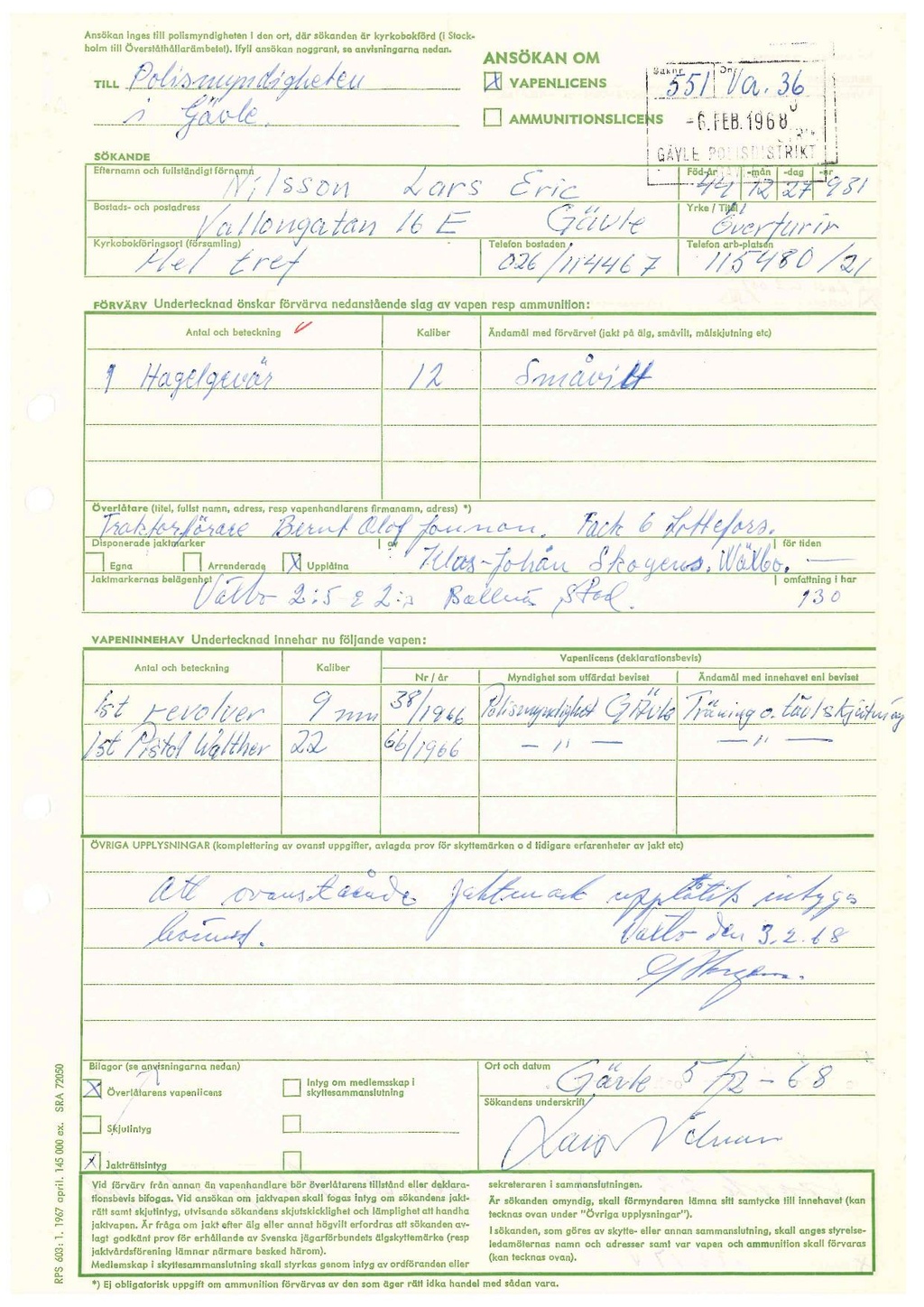 VAPENINNEHAV Undertecknad innehar nu följande vapen: