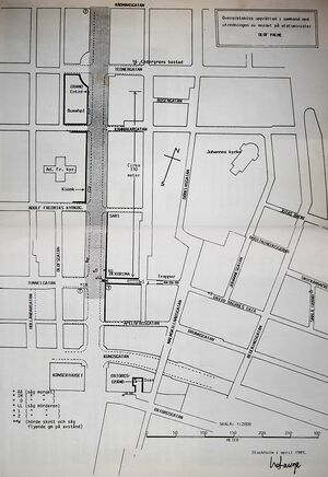 | 0 m | Mordplatsen = Olof Palmes minnesplats (Sveavägen & Tunnelgatan) |